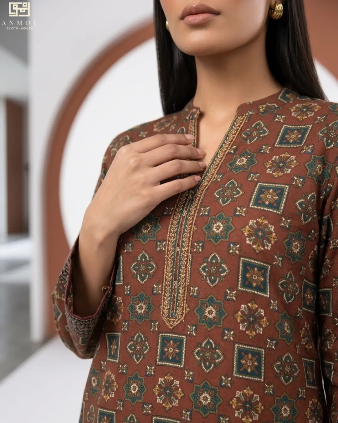 • Elegant printed design with detailed neckline
